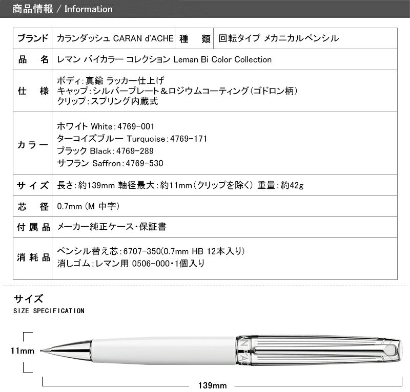 【ブランド】 カランダッシュ CARAN d'ACHE 【品 名】 レマン バイカラー コレクション Leman Bi Color Collection 【種 類】 回転タイプ メカニカルペンシル 【カ ラ ー】 ホワイト White:4769-001 ターコイズブルー Turquoise:4769-171 ブラック Black:4769-289 サフラン Saffron:4769-530 【仕 様】 ボディ:真鍮 ラッカー仕上げ キャップ:シルバープレート&ロジウムコーティング(ゴドロン柄) クリップ:スプリング内蔵式 【サ イ ズ】 長さ:約139mm 軸径最大:約11mm(クリップを除く) 重量:約42g 【芯 径】 0.7mm (M 中字) 【付 属 品】 メーカー純正ケース・保証書 【消 耗 品】 ペンシル替え芯:6707-350(0.7mm HB 12本入り) 消しゴム:レマン用 0506-000・1個入り 【商品説明】 カランダッシュが誇る艶やかで鮮やかなカラーリング技術が生かされているのが、レマン湖からインスピレーションを得てデザインされたレマンコレクションです。